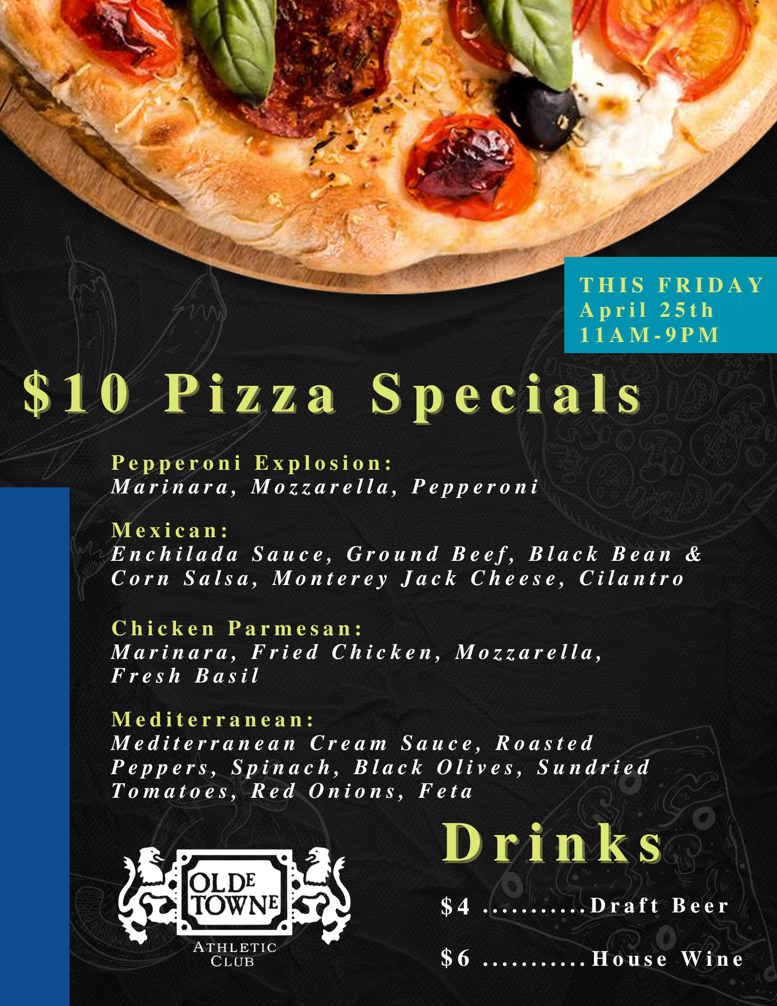 Come enjoy some pizza and drink specials all day Friday April 25th!